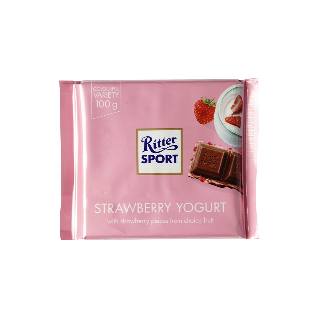 حلاوة طعم الفراولة بالياغورت مكتملاً بلذّة الشوكولاتة تصنع قطعة فريدة لا تُكرر. استمتع بشوكولاتة ريتر سبورت بالفراولة والياغورت.